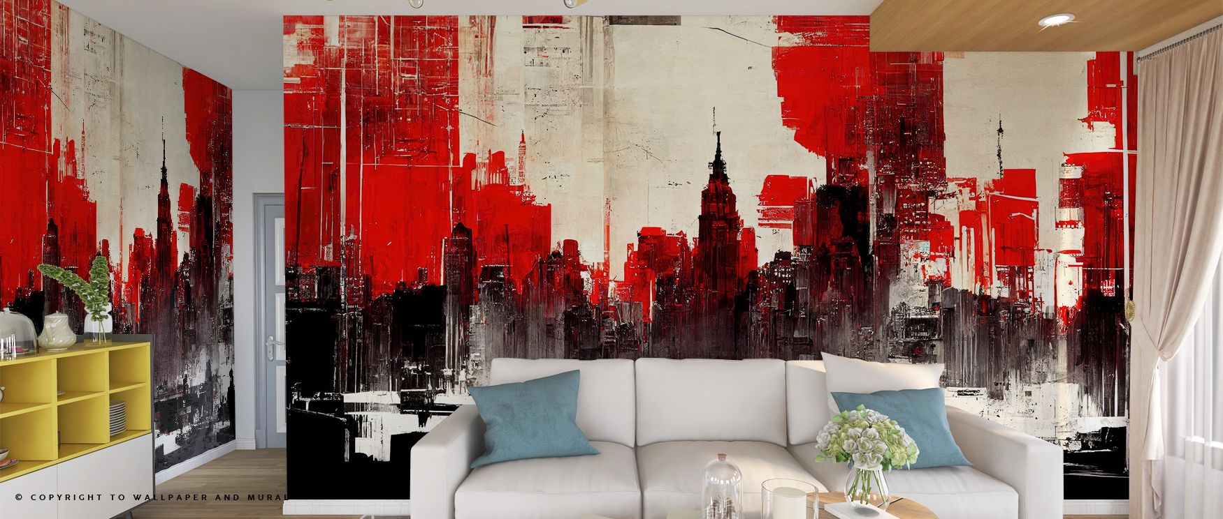 Living room with abstract cityscape mural in bold colors, showcasing urban industrial vs. urban chic wallpaper design.