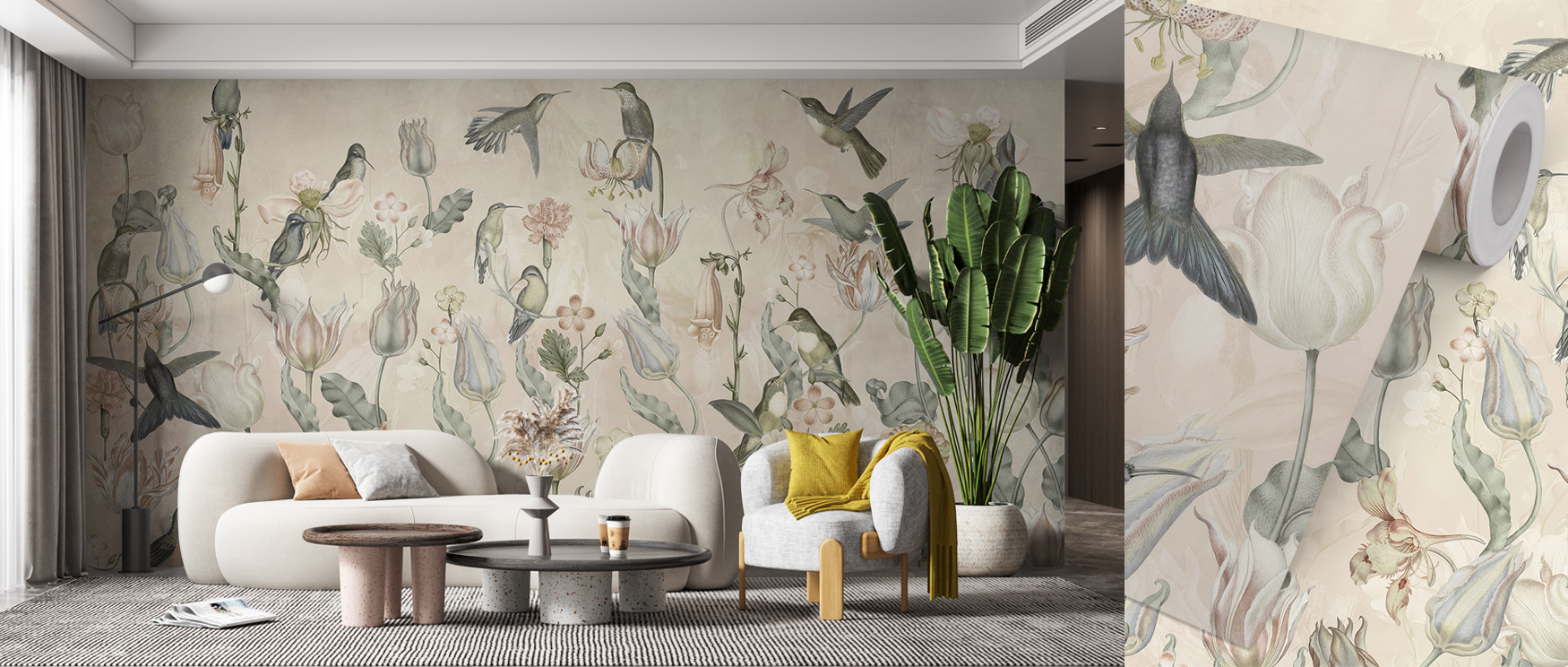 These soft hues add a touch of color without overwhelming the space, making the room feel calm and welcoming. Use pastel accents in bedding, wall art, or accessories to complement the beige wallpaper.
